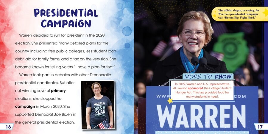 Elizabeth Warren is a well-known U.S. Senator, representing the people of Massachusetts in Congress. Warren, a Democrat, began working as a 13-year-old in Oklahoma after her father suffered a heart attack. Warren's humble beginnings and later law career informed her life in public service. This beneficial biography of the high-profile politician, written with knowledge of the key components of the science of reading, tells the story of her rise in politics and accomplishments to present day. Colorful photographs, More to Know fact boxes, and a timeline reinforce essential ideas in this informative volume.