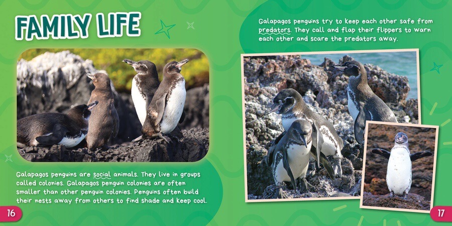 Readers may be surprised to learn that not all penguins live in the icy cold of Antarctica! In fact, Galapagos penguins make their homes on the Galapagos Islands, which are near Ecuador. One of the smallest kinds of penguin, these birds are fascinating to learn about! One fun fact is that they live in caves that were made by lava! In this volume, readers learn other essential information such as the Galapagos penguin's habitat, body adaptations, diet, and life cycle. Full-color photographs keep readers engaged with these incredible birds!