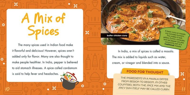 Curries, naan, and samosas are only the tip of the iceberg when it comes to Indian food. Through these and other classic Indian dishes, students learn about the cultural differences between various regions of the country. The accessible main text, enhanced with full-color photographs and intriguing fact boxes, invites young readers to savor the diverse flavors and understand the deep cultural connections that make this cuisine truly extraordinary. A list of relevant books and websites provides a jumping-off point for deeper research, and a clear, uncomplicated recipe brings the taste of India into the reader's kitchen.