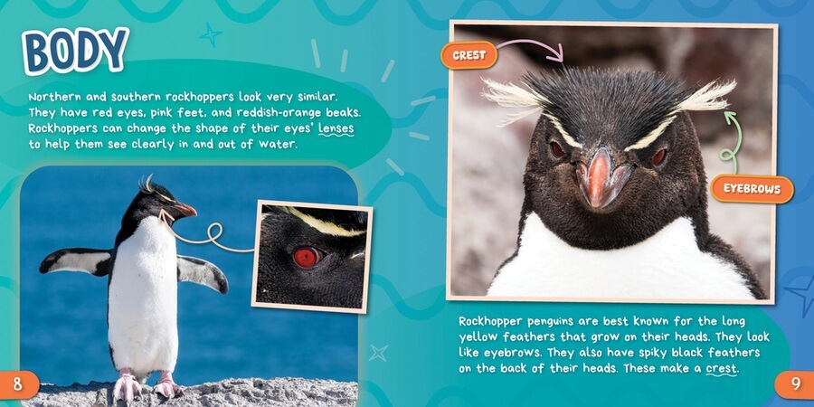 Rockhopper penguins are some of the craziest-looking penguins around! With bright yellow feathers sticking out from their face, they have a truly distinctive look. Their body adaptations, life cycle, behavior, and diet are fully explored in this volume for beginning readers. Fun facts abound in the text, such as how deep these birds can dive and where they make their burrow homes. Sentences are short and aid readers' knowledge building. Full-color photographs keep readers engaged with these cool birds!